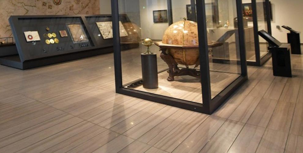 - Customized panels with calcium sulphate core, 38 mm thick, galvanized steel tray 1 mm thick and various finishes in natural stone, with perimeter in bronze brass 3 mm thick, special dimensions 1400×233 mm.