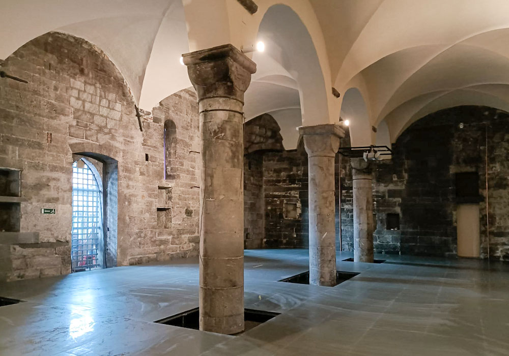 Finally, the MEI’s floating floor was completed with a glass eyelet in correspondence with the columns, making the bases and the cobblestones paving visible.
