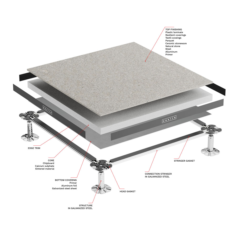 The structure is the fundamental element of a raised floor, as it determines the height over the surface it is lying on.