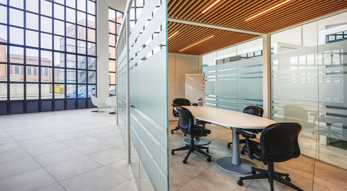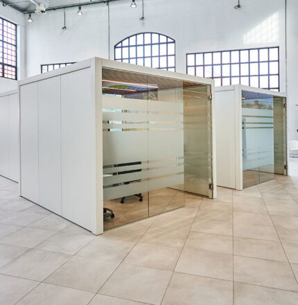 02) Integrated double-glazed partition walls, height 3.05 m, multifunction profile with surface finish painted white RAL 9010 matte color; wall infill is made of 6/6 mm clear laminated glass, with acoustic PVB in between, beveled and polished flush ground edges.