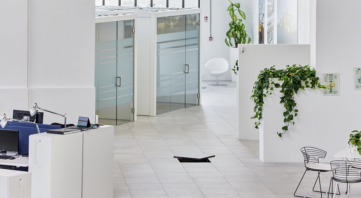 The first integrated system is the Diffuse full-surface radiant raised floor, a dry solution that encompasses a plurality of functions and benefits, going first to meet the needs of air conditioning and energy efficiency of the environment.