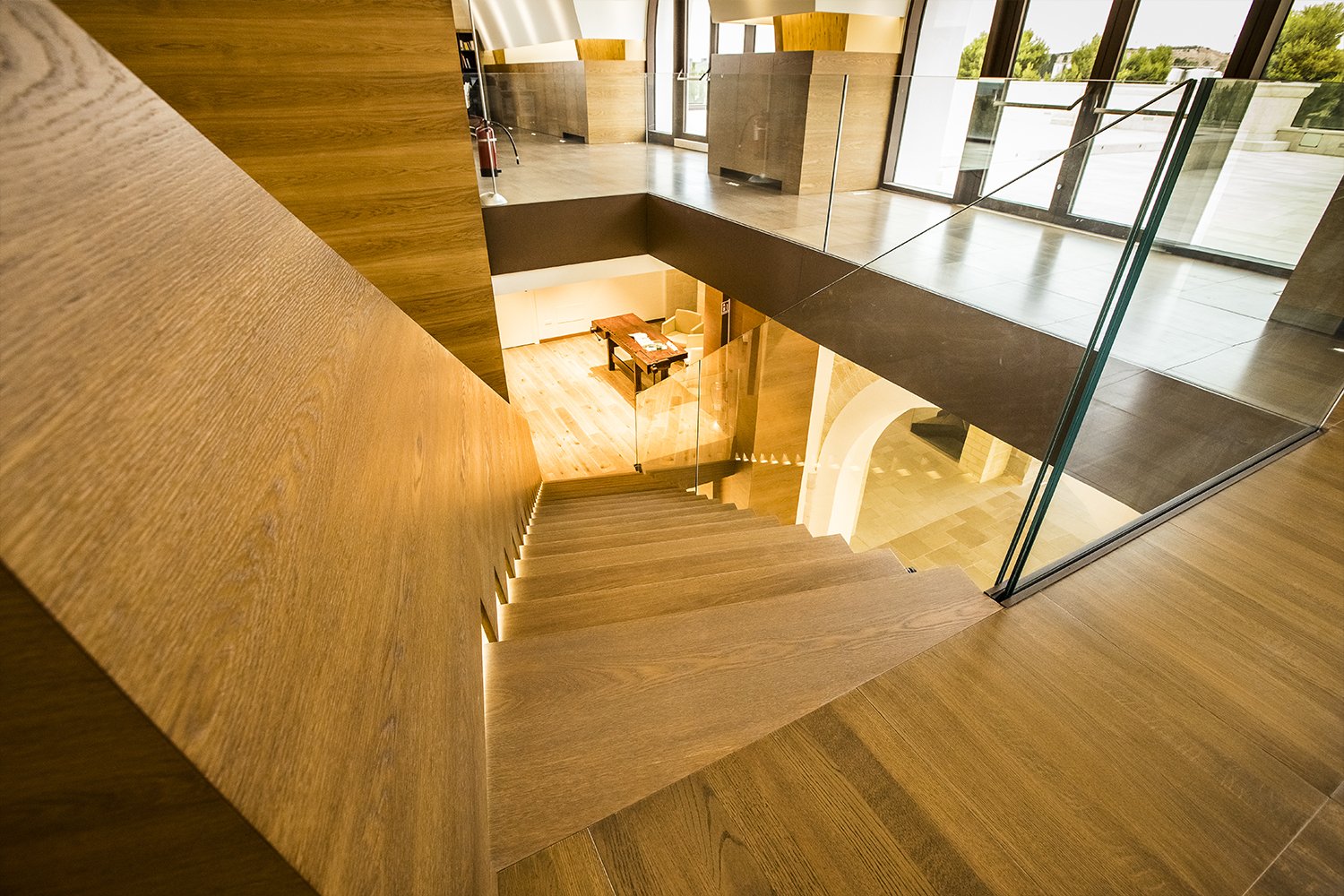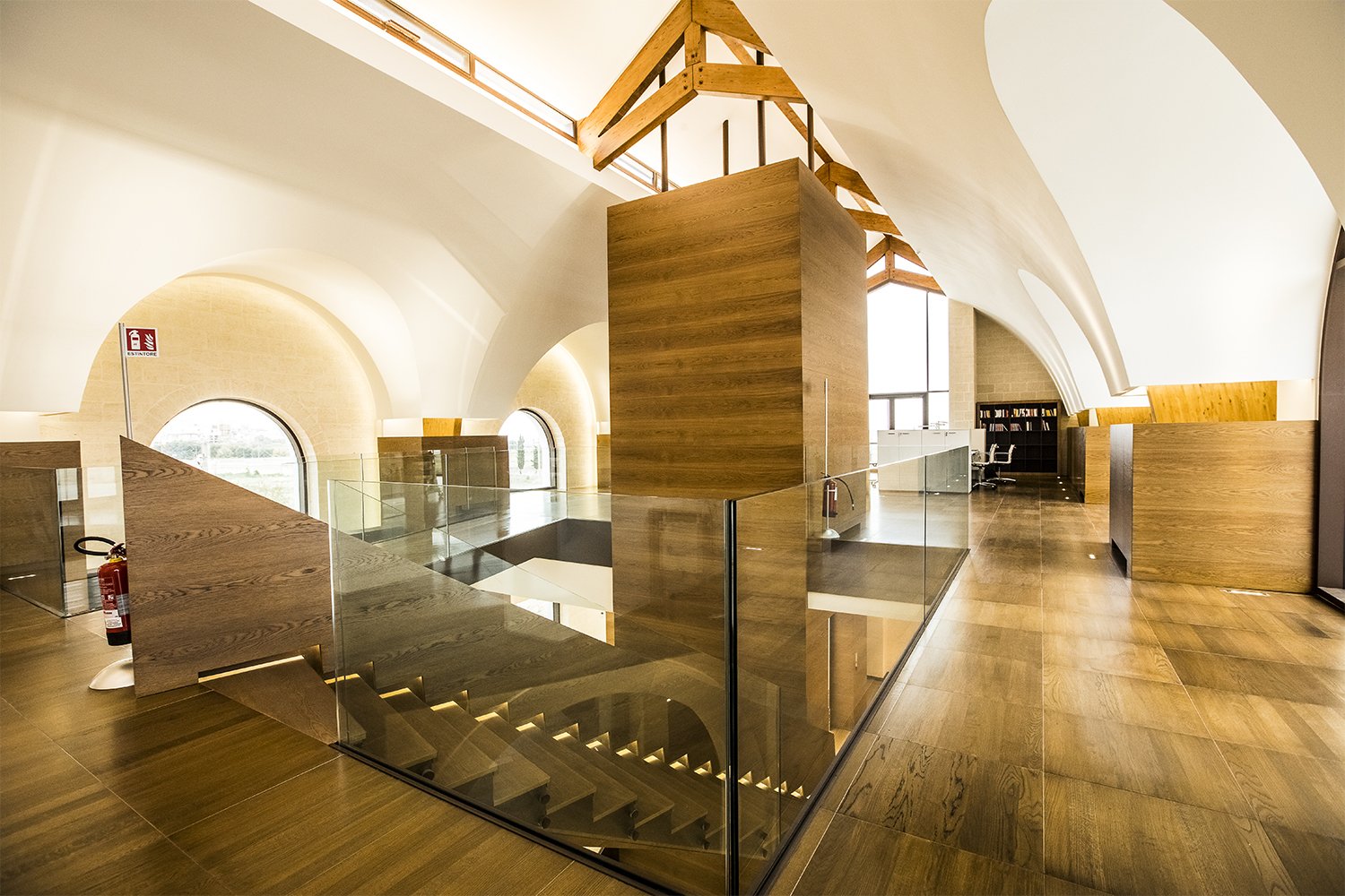 For the office area, the customer has chosen our PG3AMW60 calcium sulfate panel, 34 mm thick, with natural oak upper covering; The parquet has been specially dyed in order to resume the colors of the wooden elements of the environment.