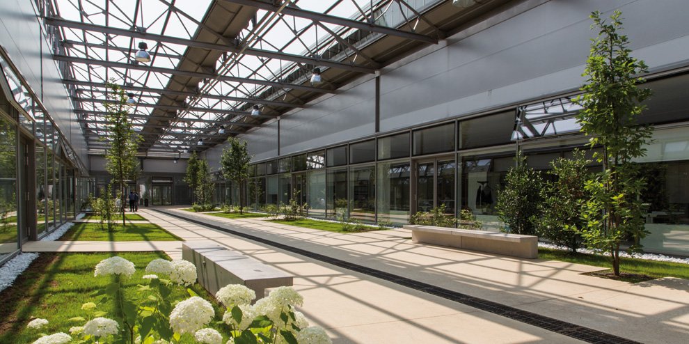The original 42,000 m2 covered surface area was converted into 29,000 m2 of offices, service facilities and planted courtyard areas that can accommodate nearly 2,000 workers. This major renovation project is unique in Italy today.