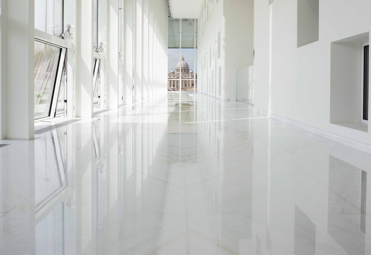 360 m2 de suelo elevado con acabado superior en mármol blanco covelano, compuesto de paneles de 60×60 cm con núcleo de sulfato de calcio de alta densidad, espesor 28 mm;