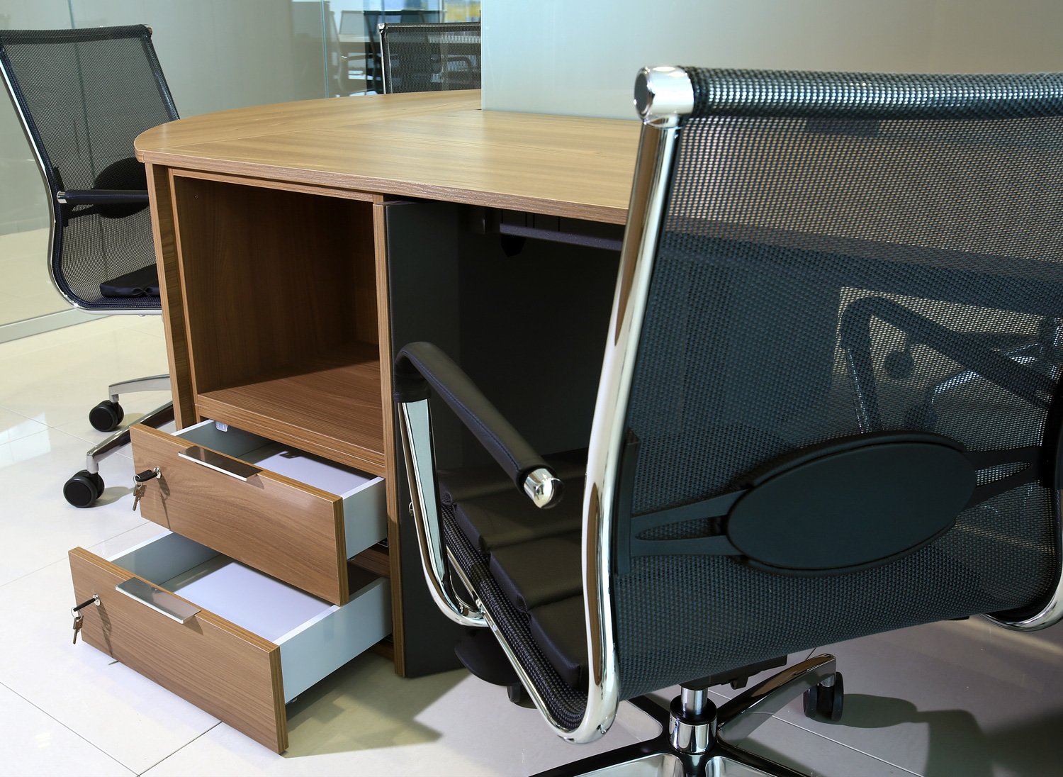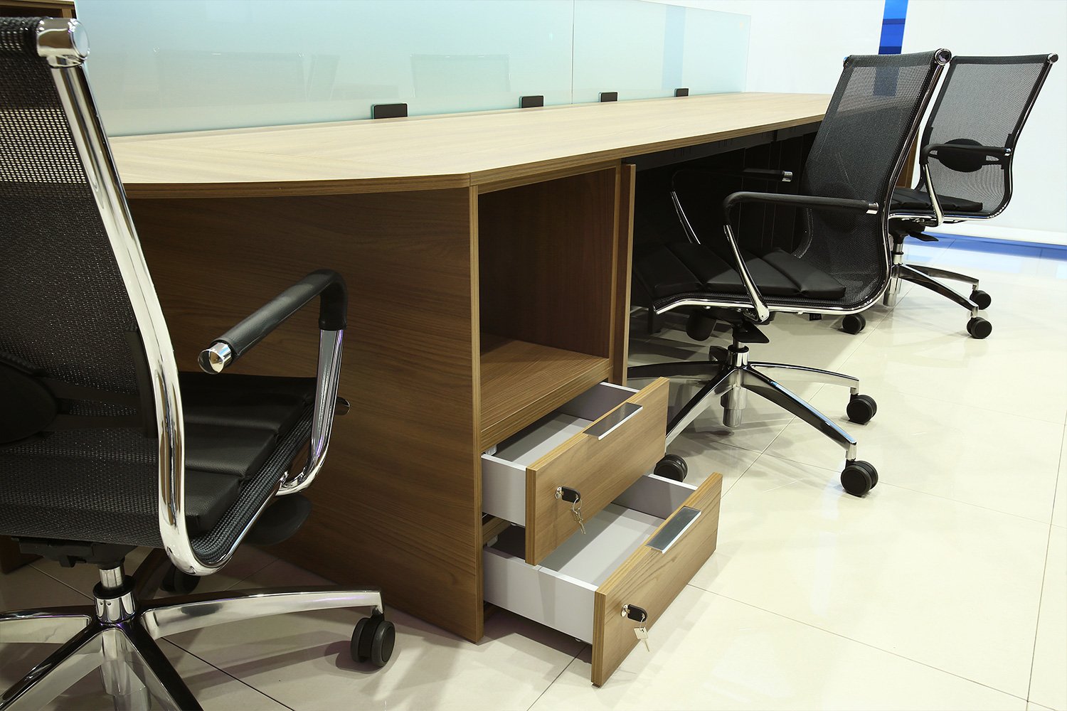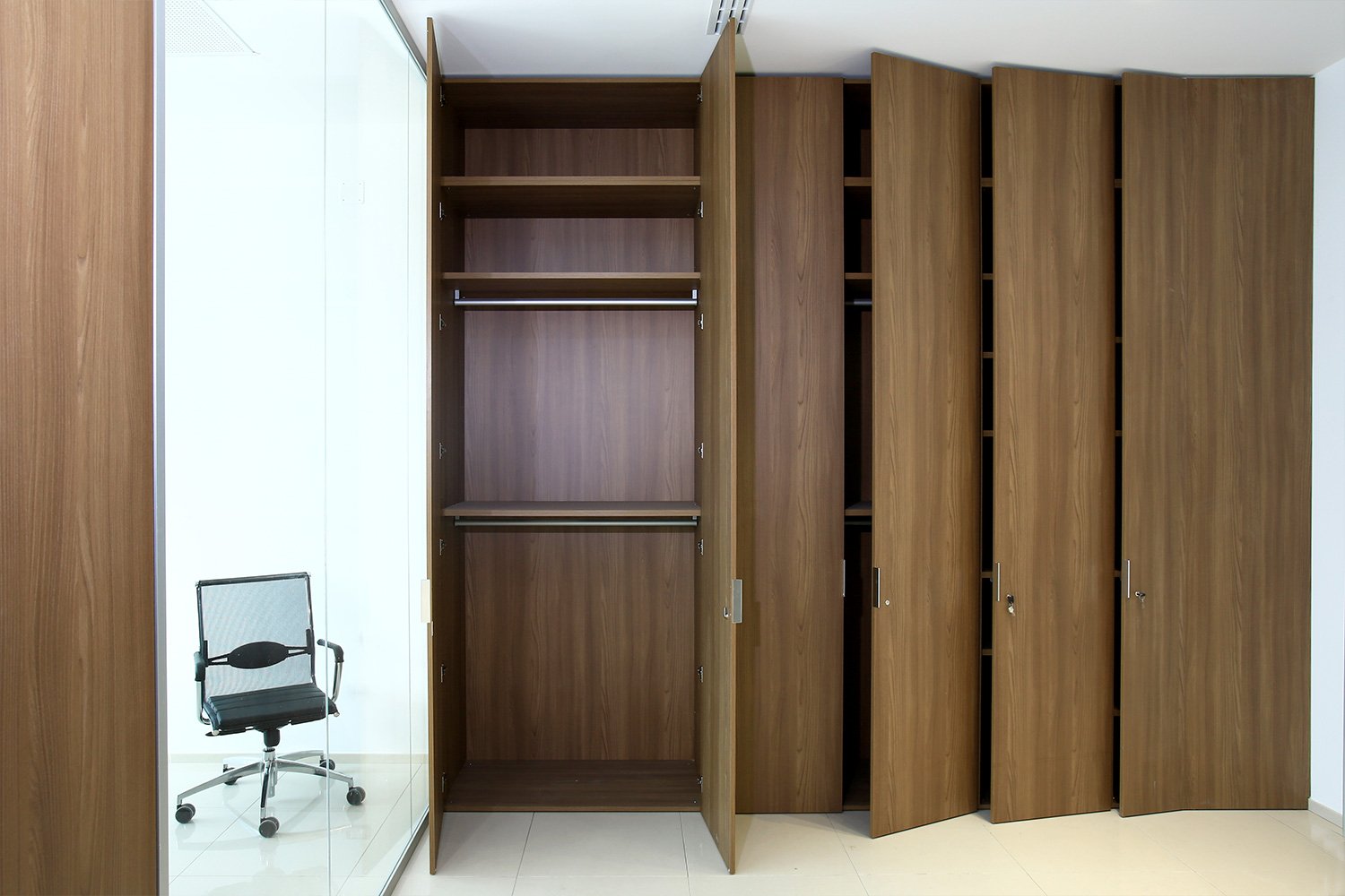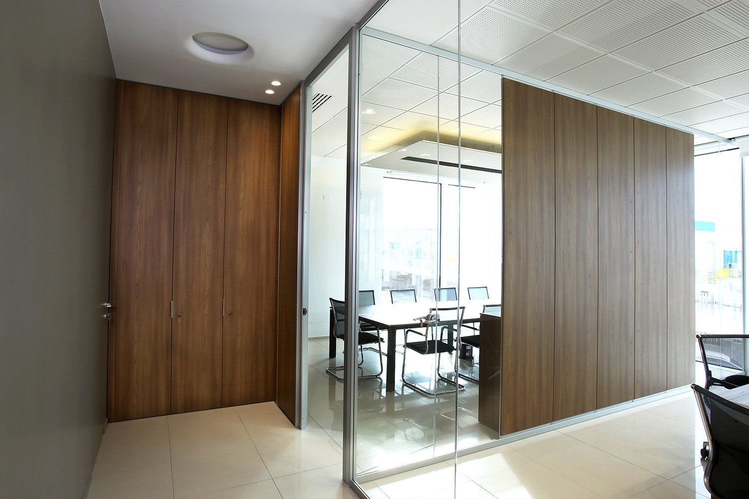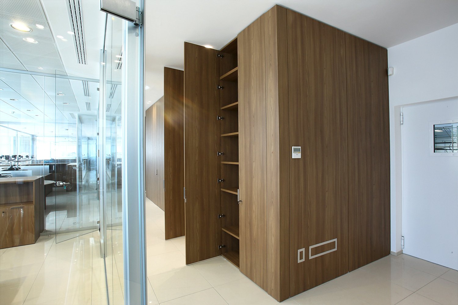 Le pareti divisorie sono state proposte in vetro extrachiaro; le pareti mobili cieche sono state rivestite con laminato dello stesso colore degli arredi in legno, su richiesta del cliente.