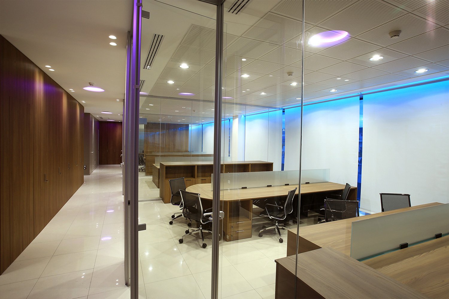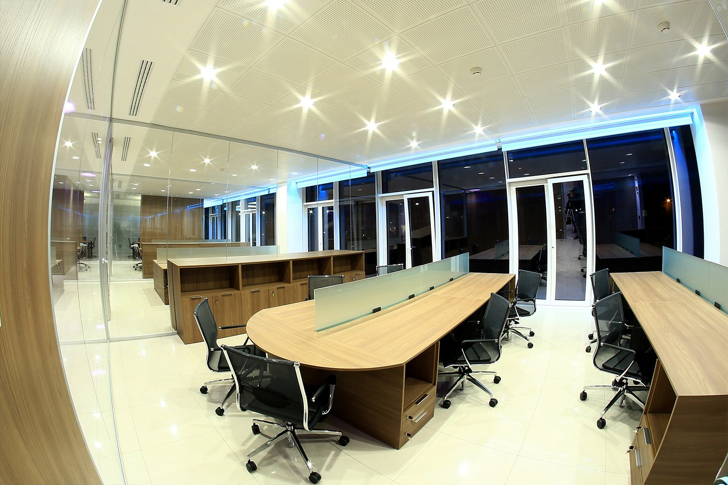 L’esigenza del cliente era avere ambienti estremamente luminosi, dove la luce potesse riflettersi creare un effetto di trasparenza all’interno dei vari uffici.