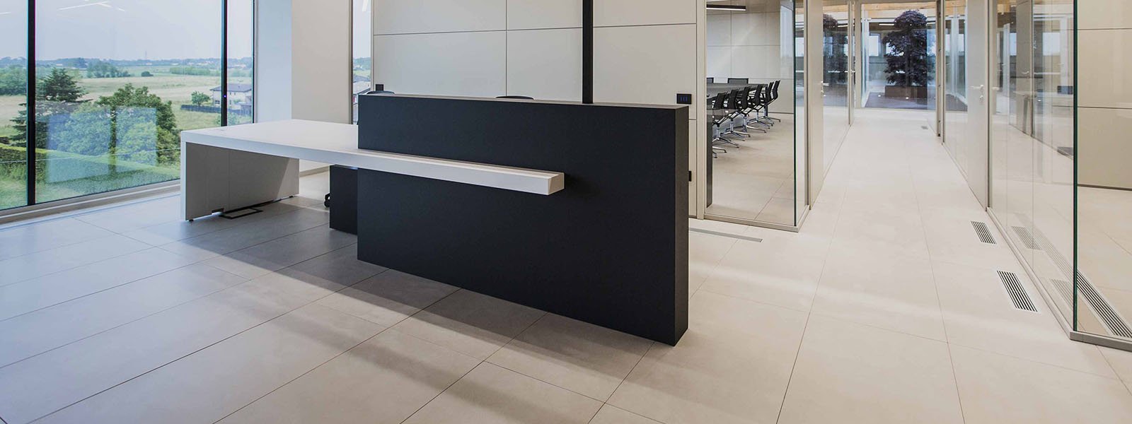 La reducción, si no la eliminación, de la separación entre el interior y el exterior también se propone en el diseño de su propia sede, donde la conexión y la continuidad se confieren precisamente mediante el uso de vidrio tanto en el interior, con la instalación de tabiques de vidrio transparente, como en el exterior, con la nueva fachada escenográfica de cristal curvo, de 49 metros de largo y 11 metros de altura.
