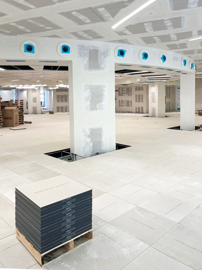 Enfin, la structure porteuse du plancher surélevé a été équipée de coussins acoustiques afin d’augmenter les performances d’absorption et d’isolation acoustique. D’un point de vue esthétique cependant, le système offre une flexibilité maximale car il est conçu pour recevoir n’importe quel type et format de finition en pose libre.