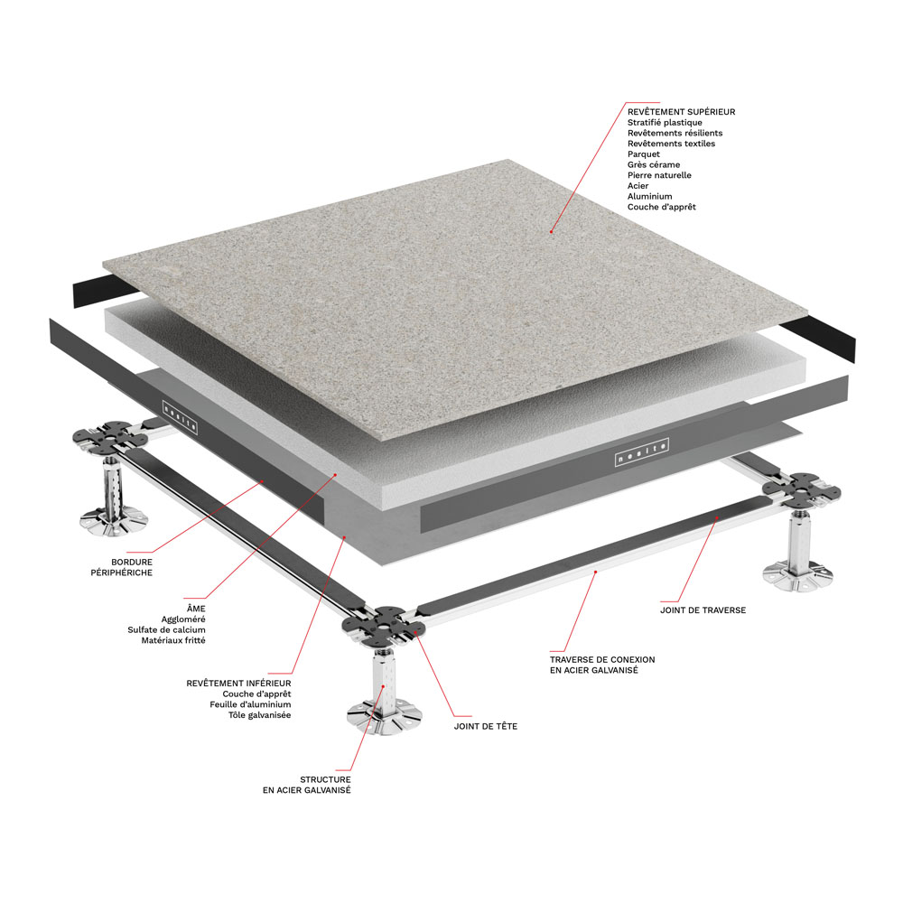 Les panneaux sont l’élément principal du plancher surélevé, car ils contribuent à garantir les charges de conception et déterminent les caractéristiques esthétiques de la pièce. Les éléments qui composent le panel sont :