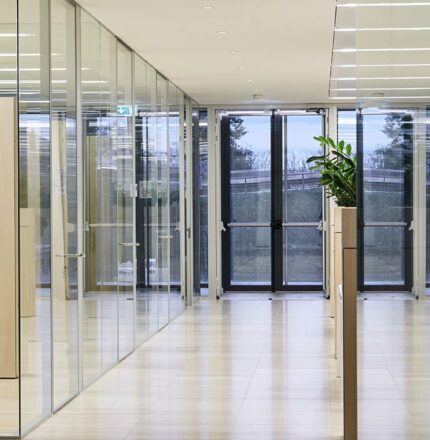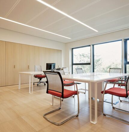 Un système spécial de cloisons mobiles en verre transparent a été utilisé pour diviser les espaces ; la structure permet en effet, grâce à des profils spéciaux, une intégration imperceptible avec les plafonds suspendus et le plancher surélevé.