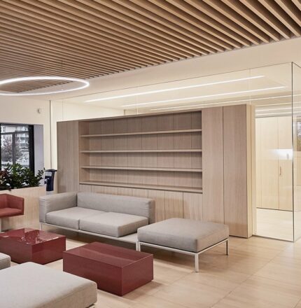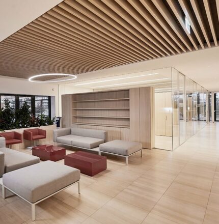 Les plafonds métalliques ont été recouverts d’un revêtement en poudre blanc mat et équipés d’un éclairage LED à rangée continue. La conception du projet par arch. Danilo Vespier a également envisagé de couler une section personnalisée en lattes de bois.