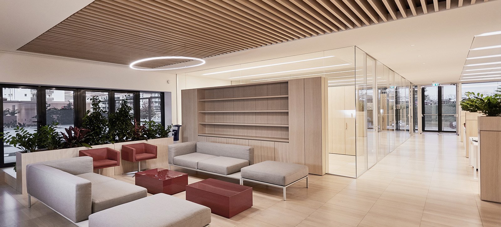 Les plafonds métalliques ont été recouverts d’un revêtement en poudre blanc mat et équipés d’un éclairage LED à rangée continue. La conception du projet par arch. Danilo Vespier a également envisagé de couler une section personnalisée en lattes de bois.