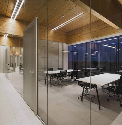 La la réduction – voire l’élimination – de la séparation de l’intérieur et de l’extérieur se reflète également dans la conception de ses propres locaux, où Le lien et la continuité sont précisément conférés par l’utilisation du verre, tant à l’intérieur, avec l’installation de parois vitrées transparentes et mobiles, qu’à l’extérieur, avec la nouvelle façade en verre. une spectaculaire façade de verre incurvée, longue de 49 mètres et haute de 11 mètres.