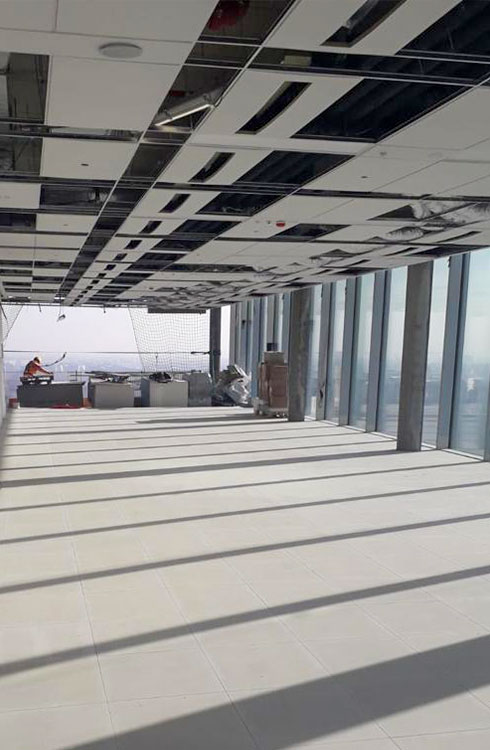 – 1 000 m2 : système composé de panneaux en sulfate de calcium, format 600×600 mm, épaisseur 30 mm, avec finition en grès cérame.