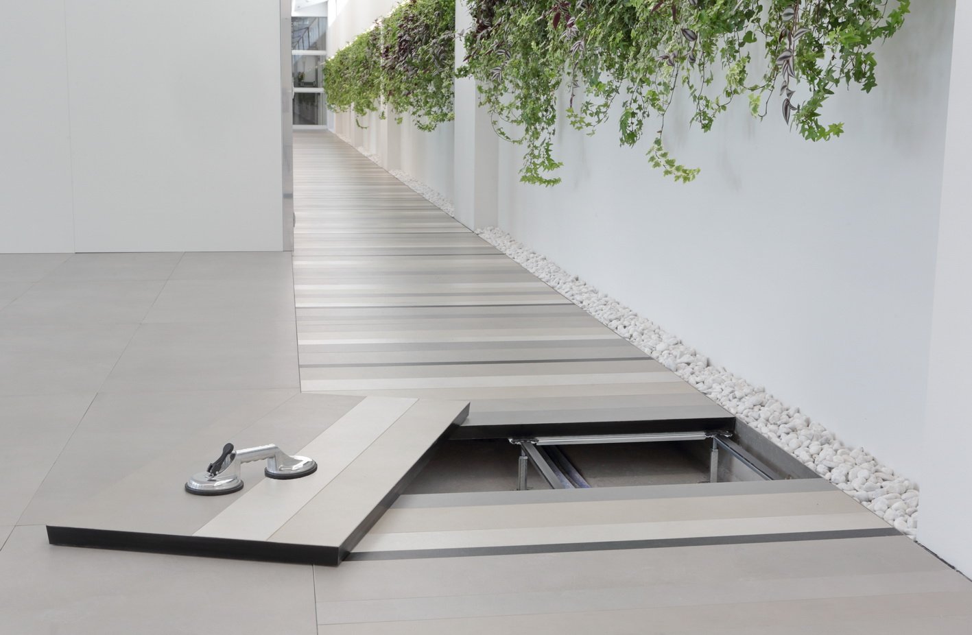 1 200 m2 de plancher surélevé composé de panneaux de 60 x 60 cm avec une âme en sulfate de calcium à haute densité, d’une épaisseur de 30 mm, et d’un revêtement de sol en grès cérame ;