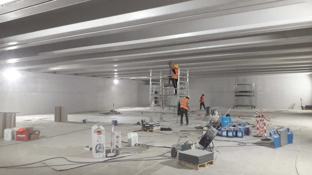 Le système construit, composé de panneaux modulaires de 35 mm d’épaisseur avec un revêtement en PVC conducteur, renforcé par une plaque d’acier, est conçu pour supporter la charge de plus de 150 racks pour une poids total de plus de 340 tonnes, tandis que la cavité souterraine permet le passage d’environ 156 km de câbles. La structure de type BPC, quant à elle, comporte des calculs sismiques et des longerons spéciaux à haute résistance.