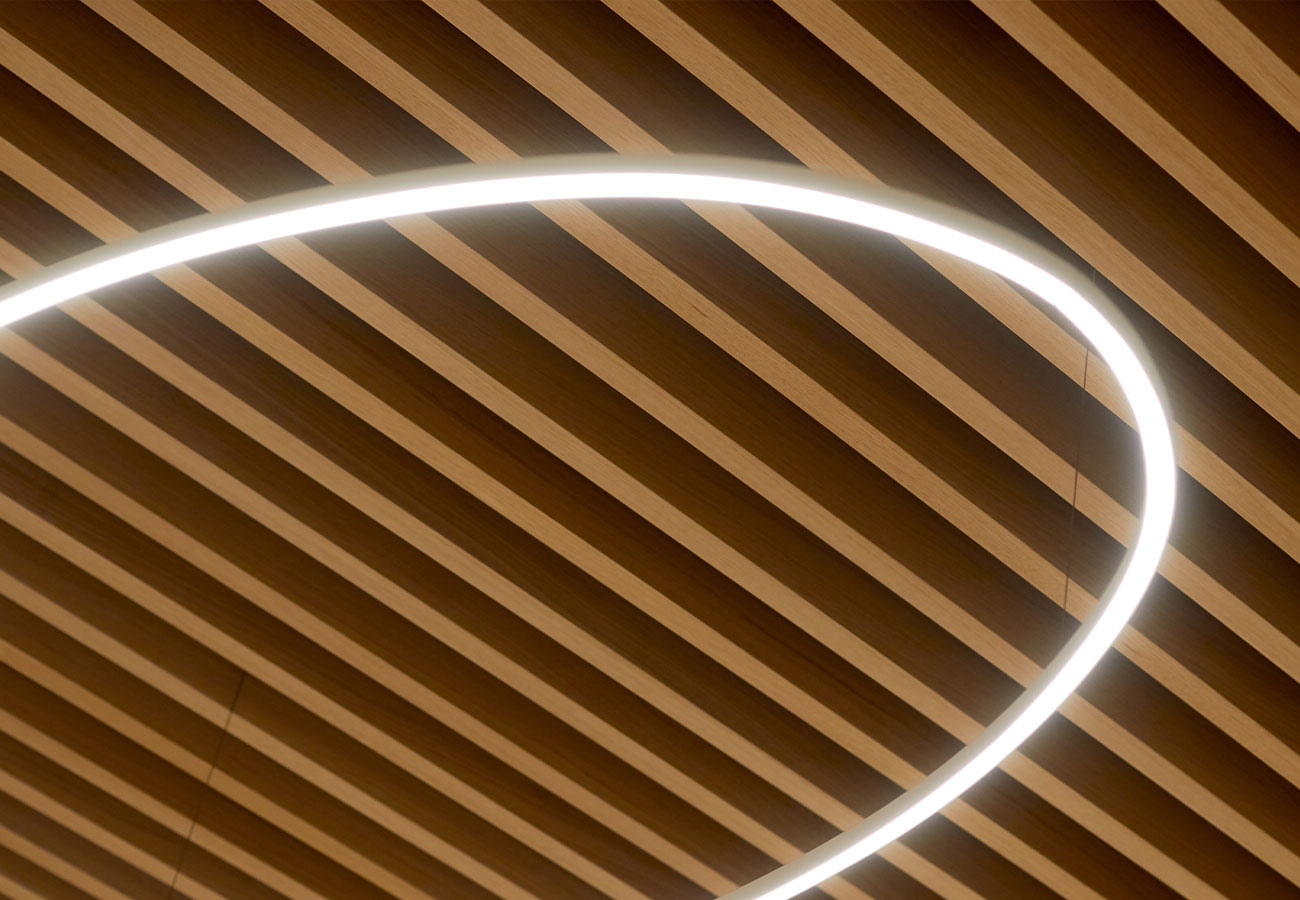 Kairos propone un’illuminazione a fila continua ottenuta con strip LED versione slim, inserite nel bandraster. Si tratta di una soluzione a basso voltaggio e quindi a risparmio energetico. Controllabile da remoto con i vari sistemi di gestione domotica.