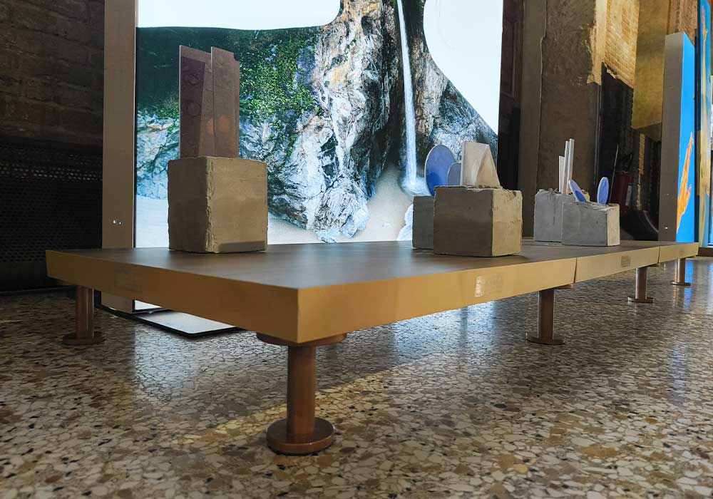 Così, il pavimento sopraelevato diventa fondamento, soglia e respiro della mostra.