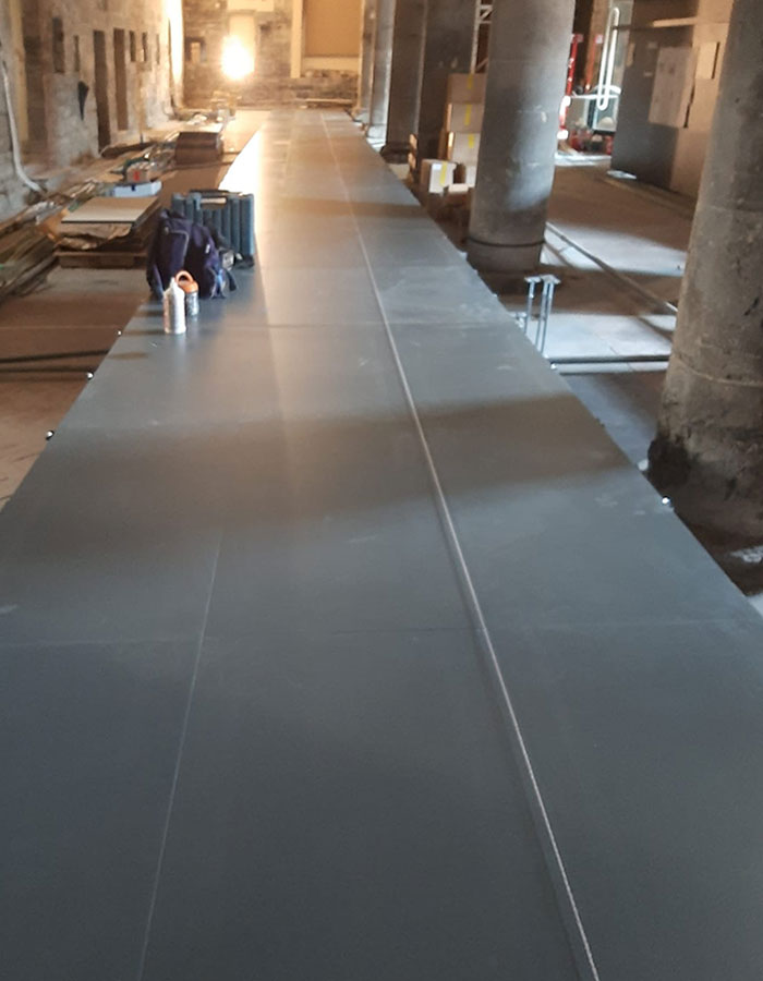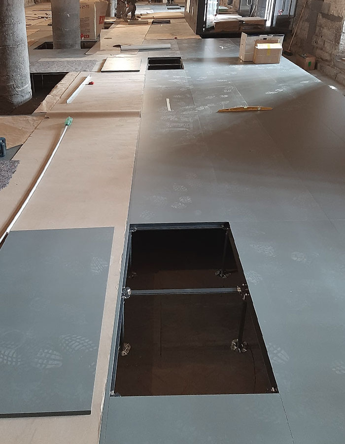 L’integrazione del sistema pavimento nel progetto, che contempla importanti opere impiantistiche, ha innanzitutto minimizzato l’ingombro delle canalizzazioni, di fatto celate nell’intercapedine, agevolando l’ispezionabilità. La sua installazione poi, ha consentito di eliminare i dislivelli esistenti tra i diversi ambienti, promuovendo un accesso sicuro e senza barriere per i visitatori diversamente abili.