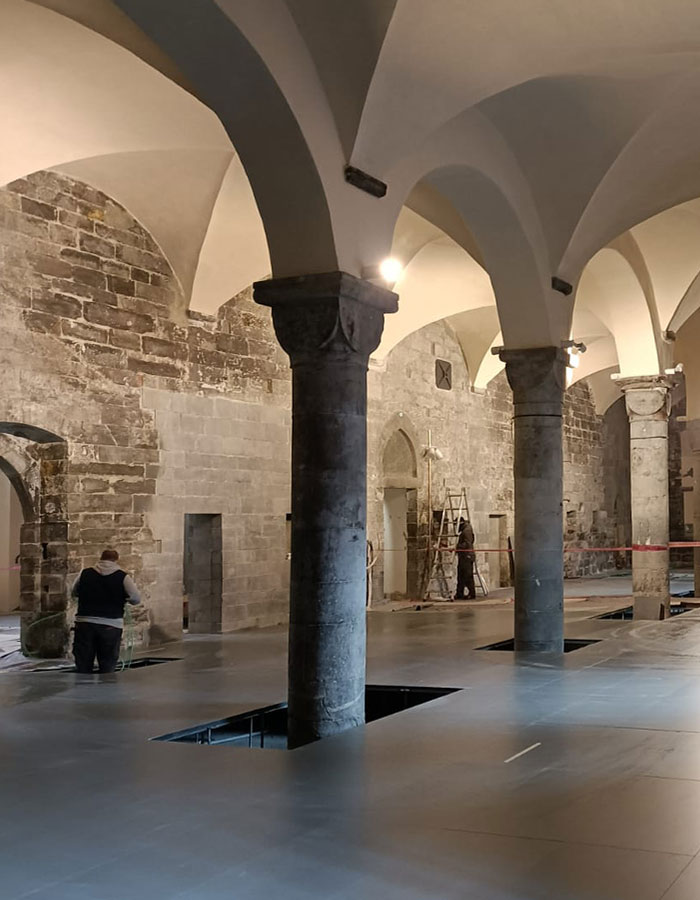 La pavimentazione flottante del MEI, infine, è stata completata con la realizzazione di un’asola in vetro in corrispondenza delle colonne, che rende visibili i basamenti e la pavimentazione di fondo in acciottolato.