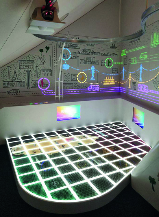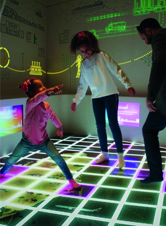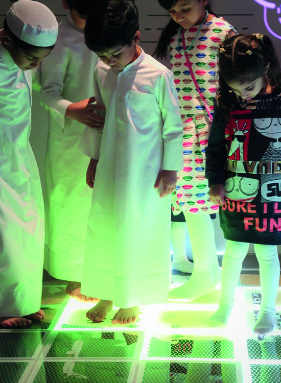 L’isola, costituita da pannelli in formato speciale 300×300 mm raffigurante la mappa del Qatar, risponde agli stimoli touch grazie all’integrazione di uno speciale software. I più piccoli rispondono alle domande appoggiando parti del corpo sulle piastrelle, che si illuminano e cambiano colore.