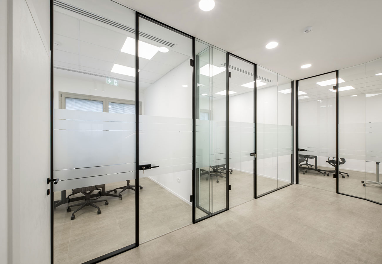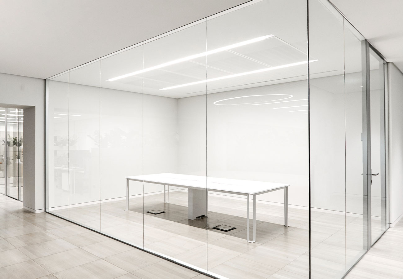 Le pareti sono realizzate in vetro stratificato di sicurezza, da 10 o 12 mm di spessore, con interposto PVB acustico per un isolamento certificato di 39 dB, nella versione mono vetro, e 47dB nell’opzione doppio vetro. Le pareti sono realizzate con profili intercambiabili, che permettono sempre la riconfigurazione.