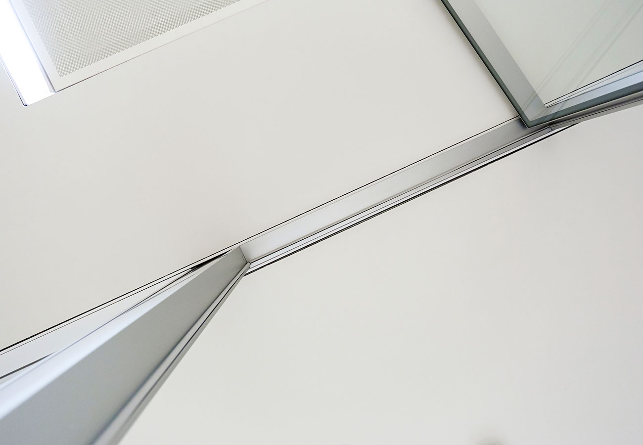 Le pareti integrate nel sistema Kairos rappresentano un elemento dalla elevata valenza sia estetica che di comfort, caratterizzato dall’inserimento a scomparsa nel pavimento e nel soffitto, conferito dagli appositi profili integrati a filo nei due componenti.