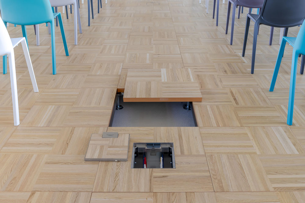 • pavimento per interno: sistema composto da pannelli in solfato di calcio, spessore 34 mm, con finitura in rovere spazzolato con pattern a quattro riquadri, e struttura MPL.