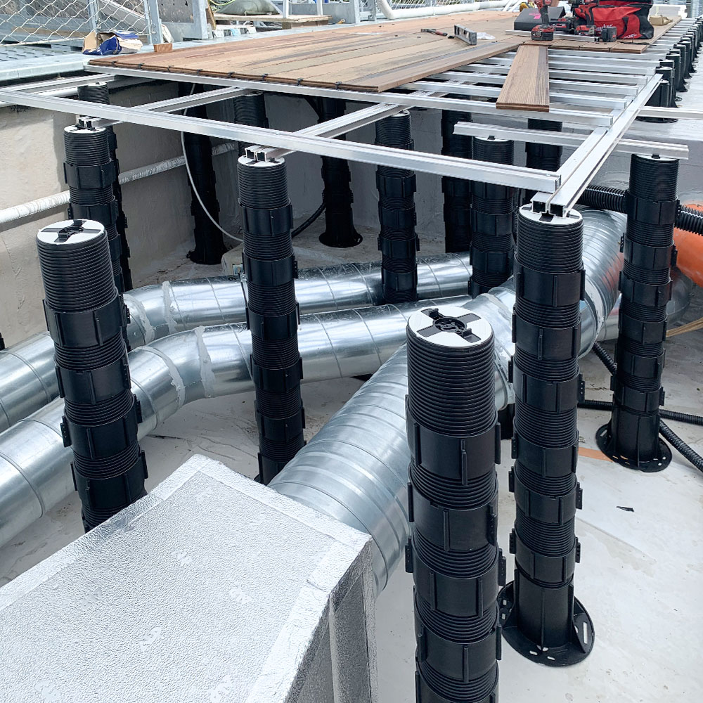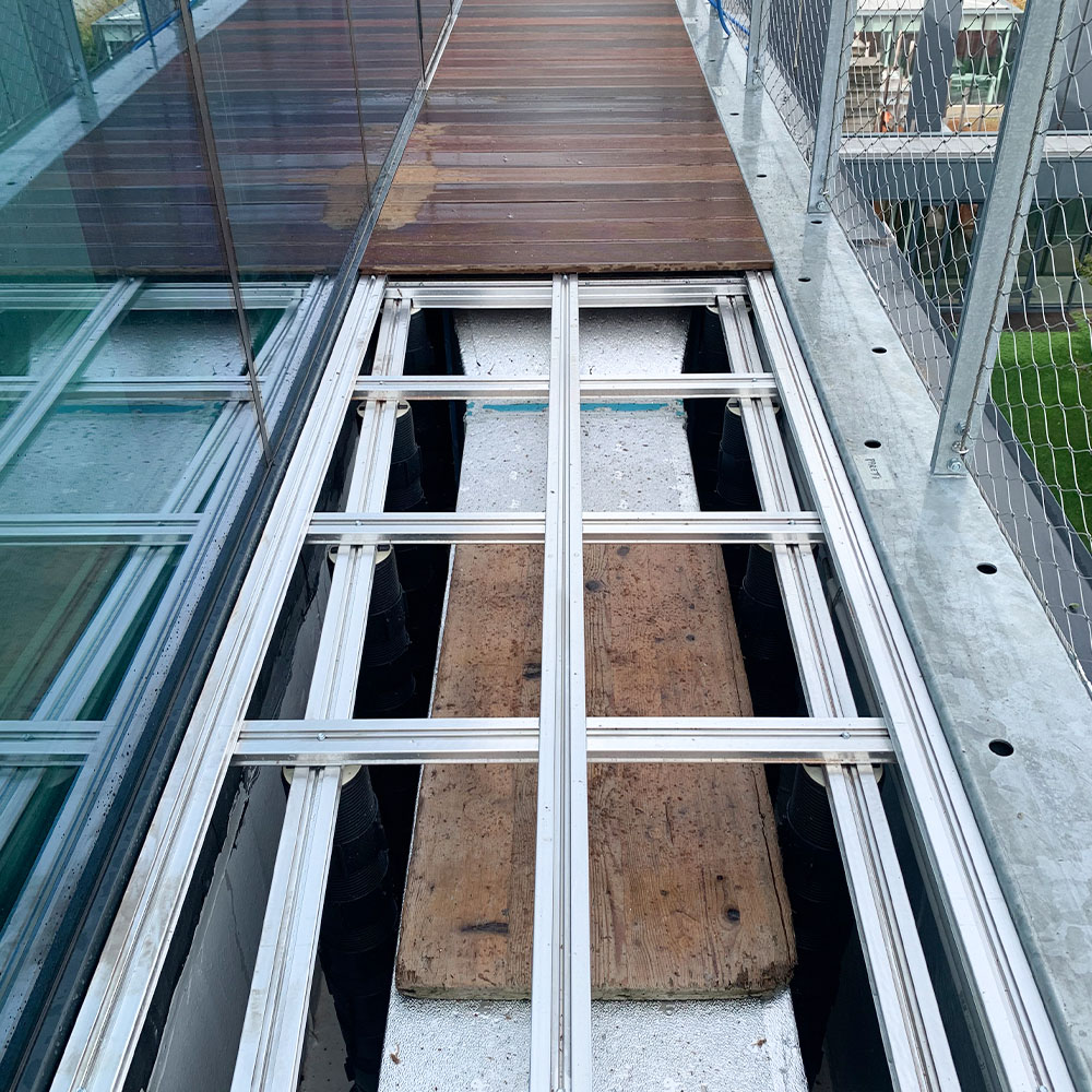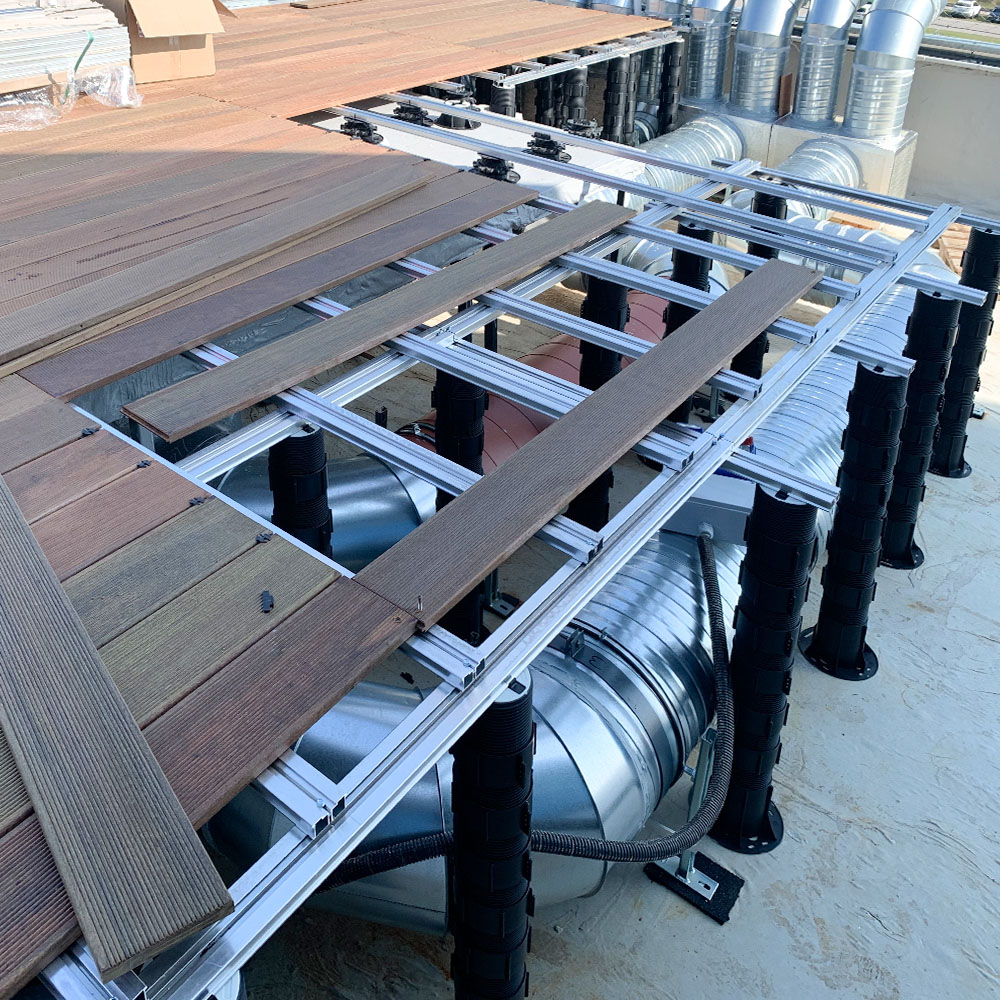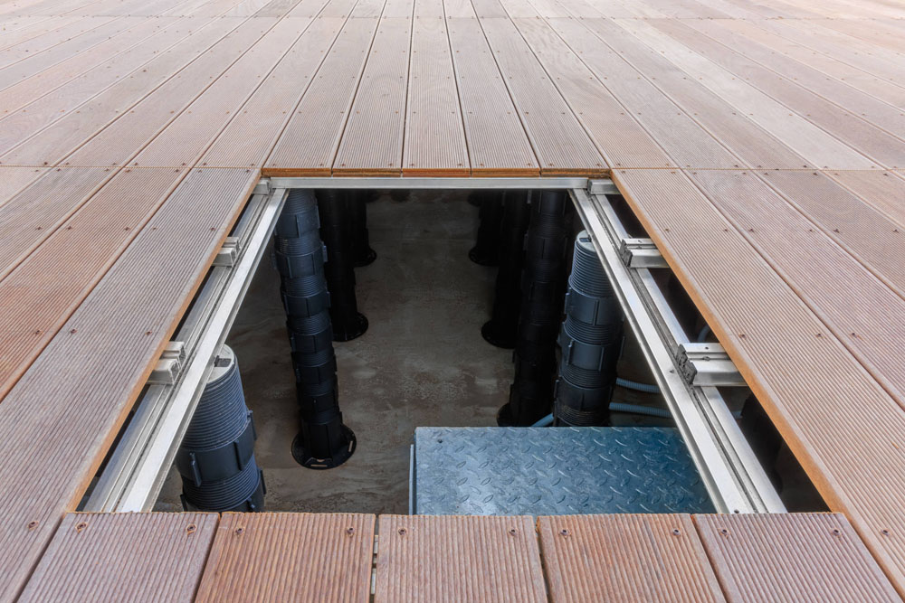 • pavimento per esterno: sistema composto da doghe in legno IPE naturale, installato su struttura speciale per altezze ed ingombri sottopavimento elevati.