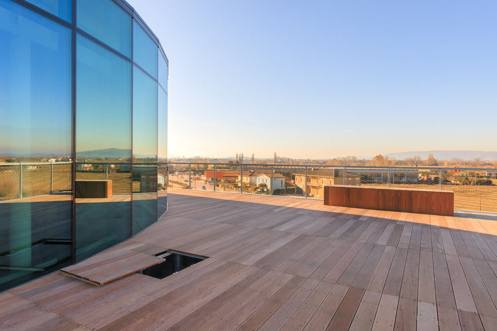 La soluzione outdoor progettata da Nesite ha previsto lo sviluppo di un sistema a doghe in legno IPE di colore naturale, collocato su una struttura speciale pensata per altezze proibitive ed ingombro impianti fuori modulo da scavalcare, mantenendo l’ispezionabilità.