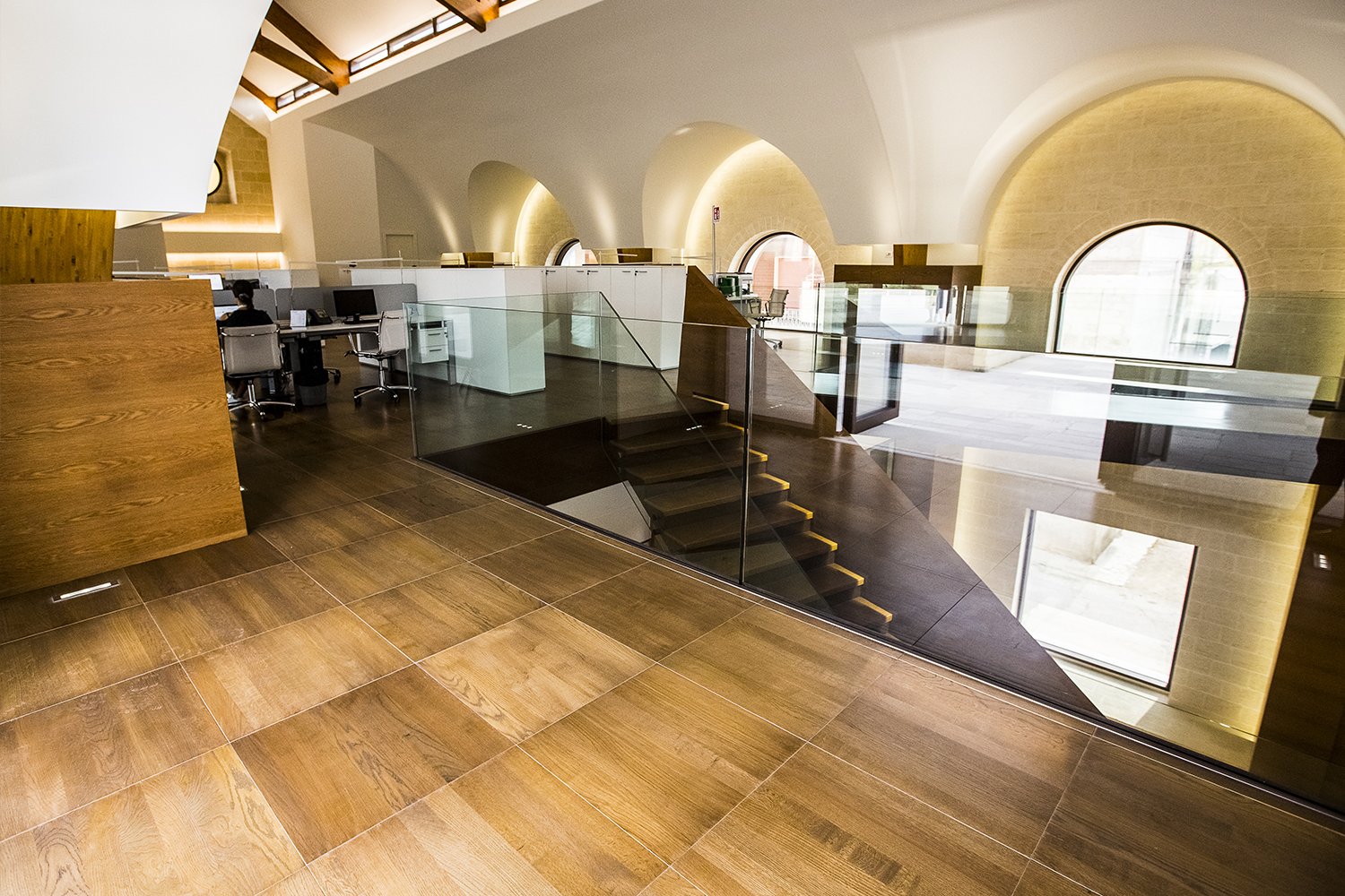 - Fornitura e installazione di pavimento sopraelevato con finitura in parquet nell’area direzionale;