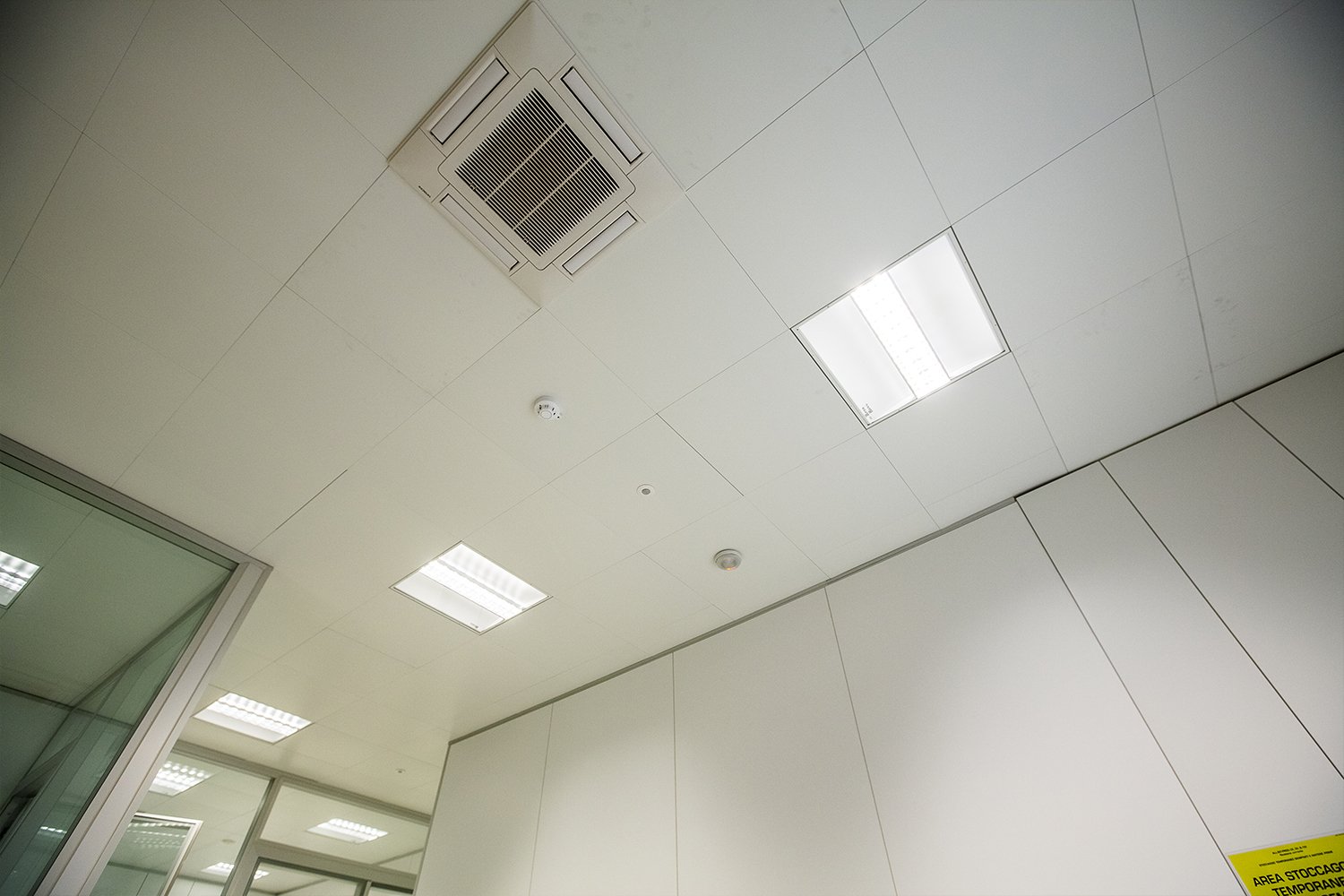 Anche in questo caso, per la zona laboratori i controsoffitti dovevano rispondere a determinate caratteristiche di tenuta ed ermeticità. E’ stato quindi utilizzato un pannello tipo ECO LAB a tenuta in dim. 600 x 600 mm in acciaio preverniciato di colore bianco con molle preincorporate e speciale guarnizione ermetica applicata direttamente in fabbrica.