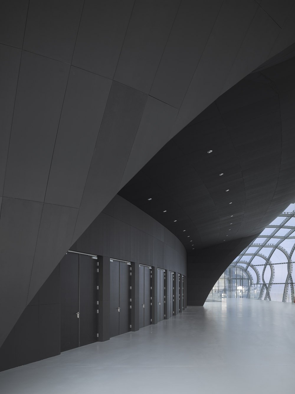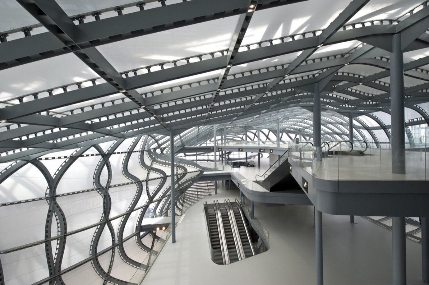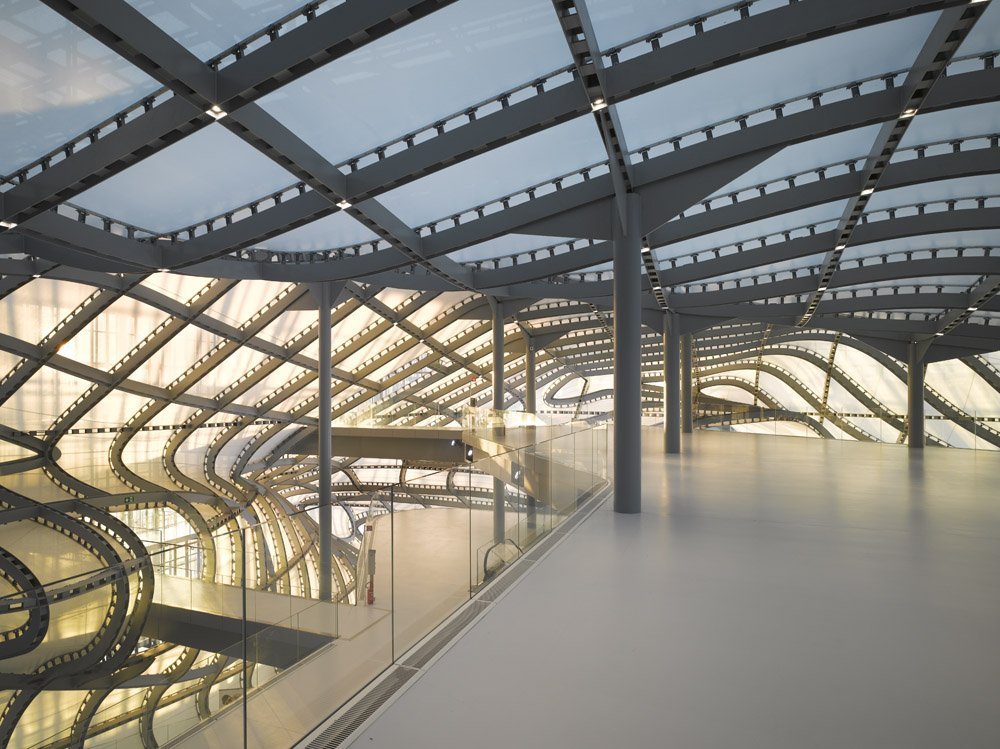 All’interno, 5 livelli (supportati da scale mobili e passerelle) conducono ad un auditorium dalla capacità di circa 1.800 persone.
