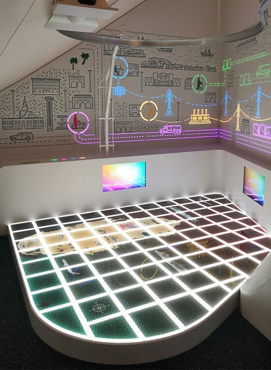 È in questo contesto che il nostro pavimento sopraelevato diventa una piattaforma ludica interattiva in stile twister dove i più piccoli rispondono alle domande appoggiando parti del corpo sulle piastrelle, che si illuminano e cambiano colore. L’isola è stata interamente realizzata con i pannelli a led JUNO e risponde agli stimoli touch grazie all’integrazione di uno speciale software.