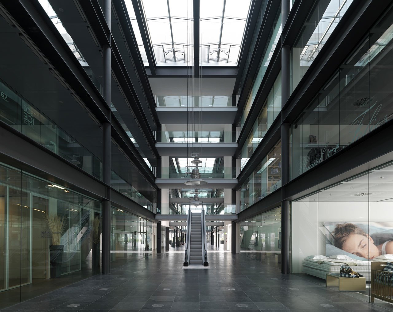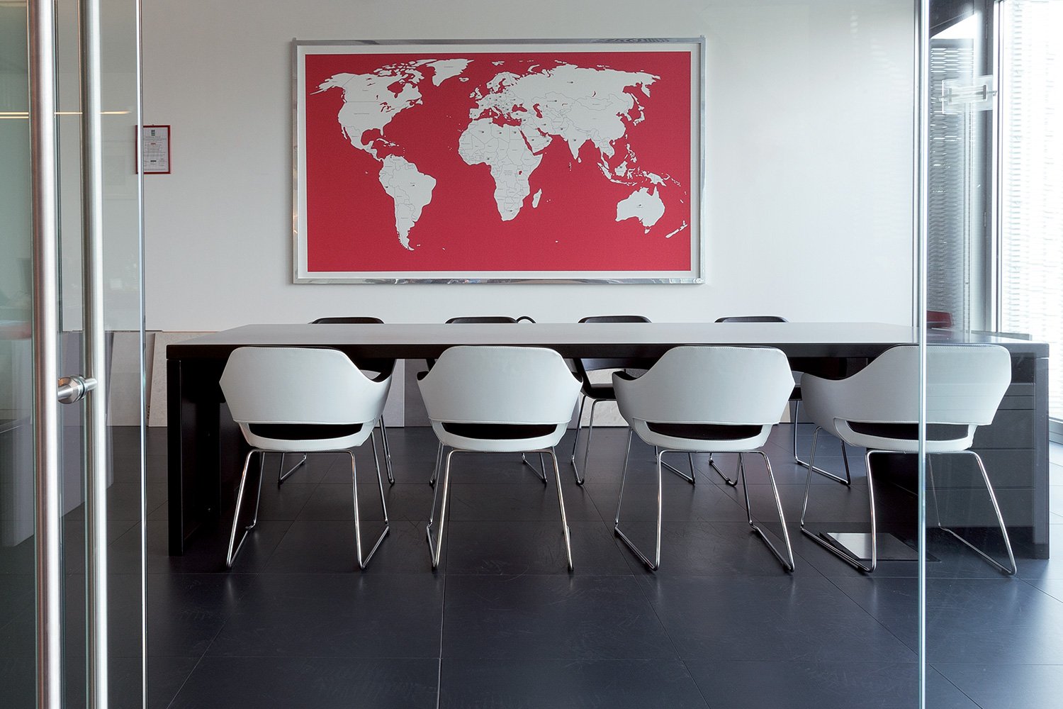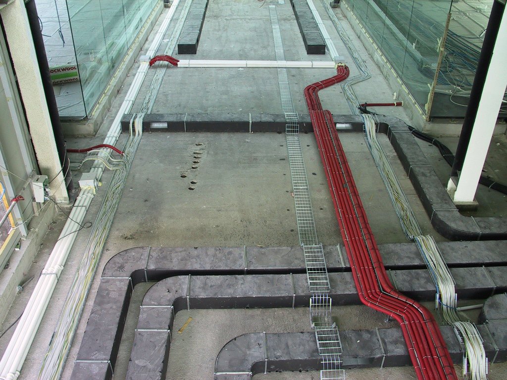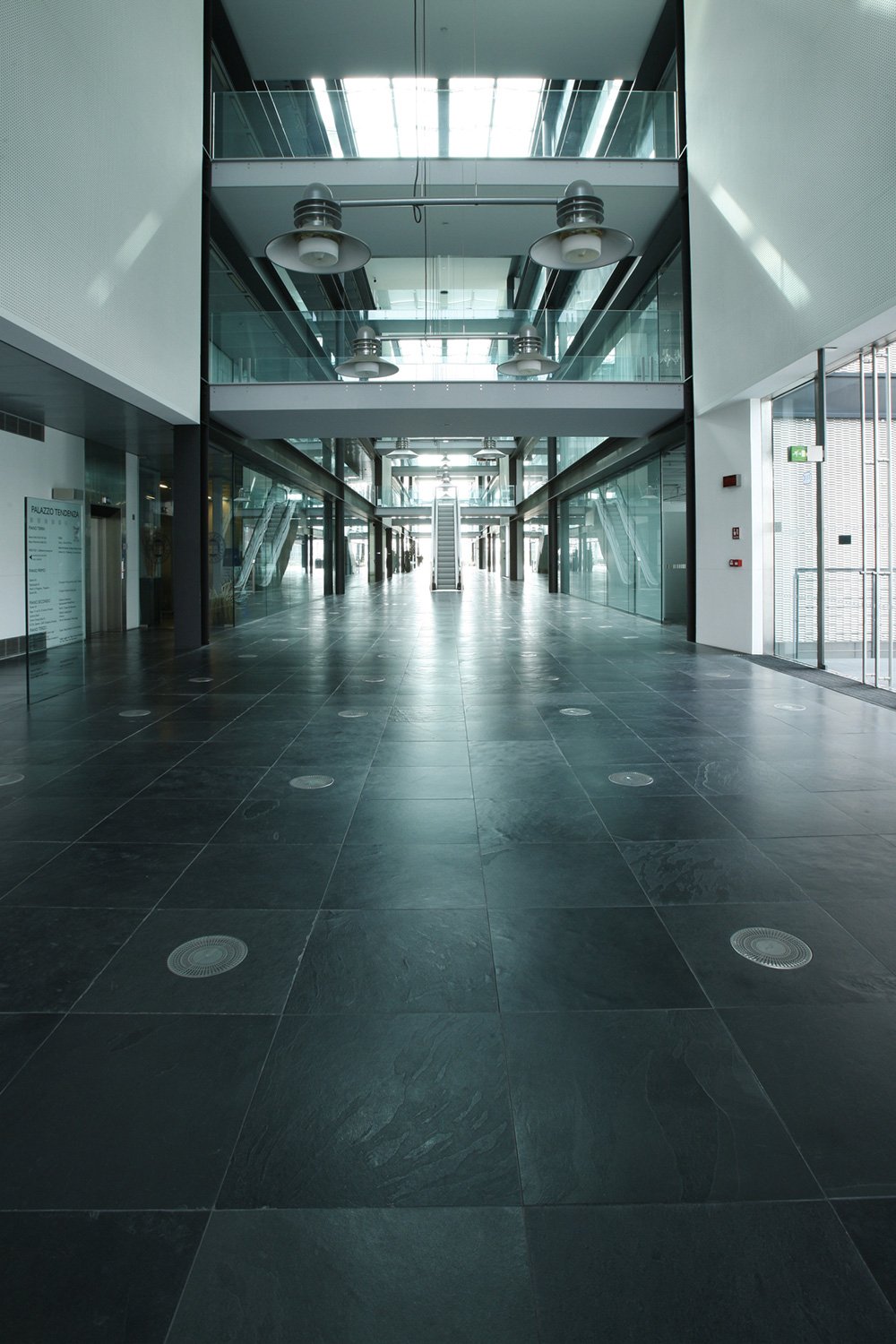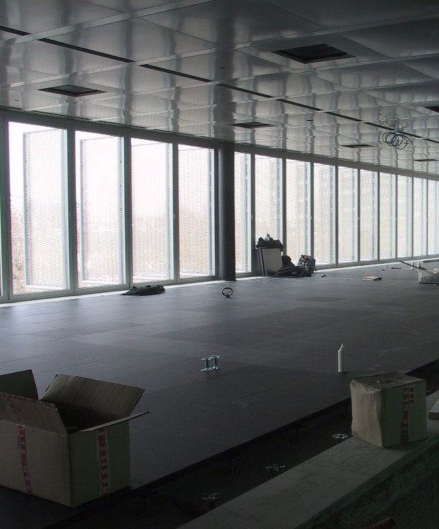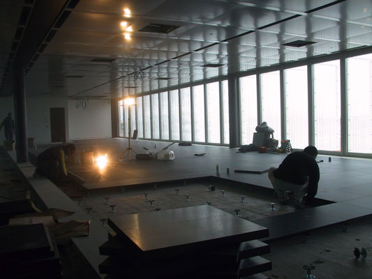 » 26.000 m2 pavimento sopraelevato composto da pannelli in formato speciale, 607,5 x 607,5 mm, e varie finiture superiori come il linoleum, gres porcellanato e ardesia naturale a spacco.