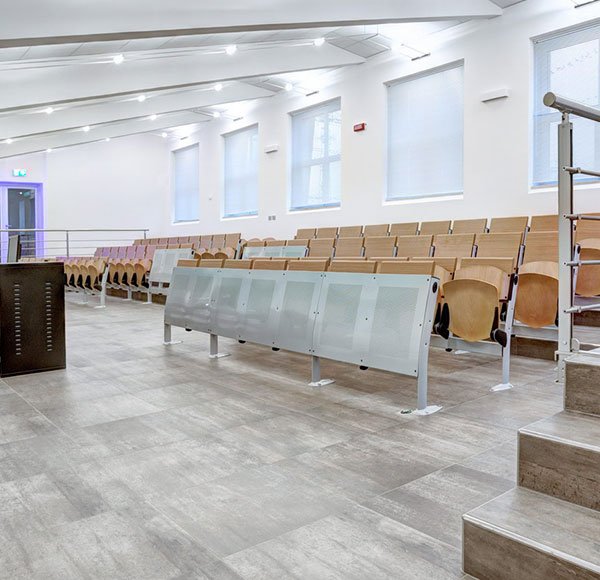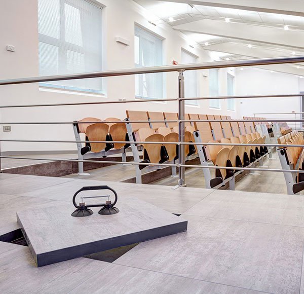 I gradoni e le rampe dell’auditorium sono state realizzate mediante l’impiego di una struttura portante nascosta in acciaio, assemblata in opera, rivestita poi con pavimento Tetris in solfato sp. 28 mm dim. nom. 60 x 120 mm e rivestimento in gres effetto legno; il risultato è una struttura monolitica che mantiene comunque ispezionabili alcune aree, al fine di soddisfare l’esigenza di poter accedere alle macchine per il trattamento aria alloggiate al di sotto della gradonata.