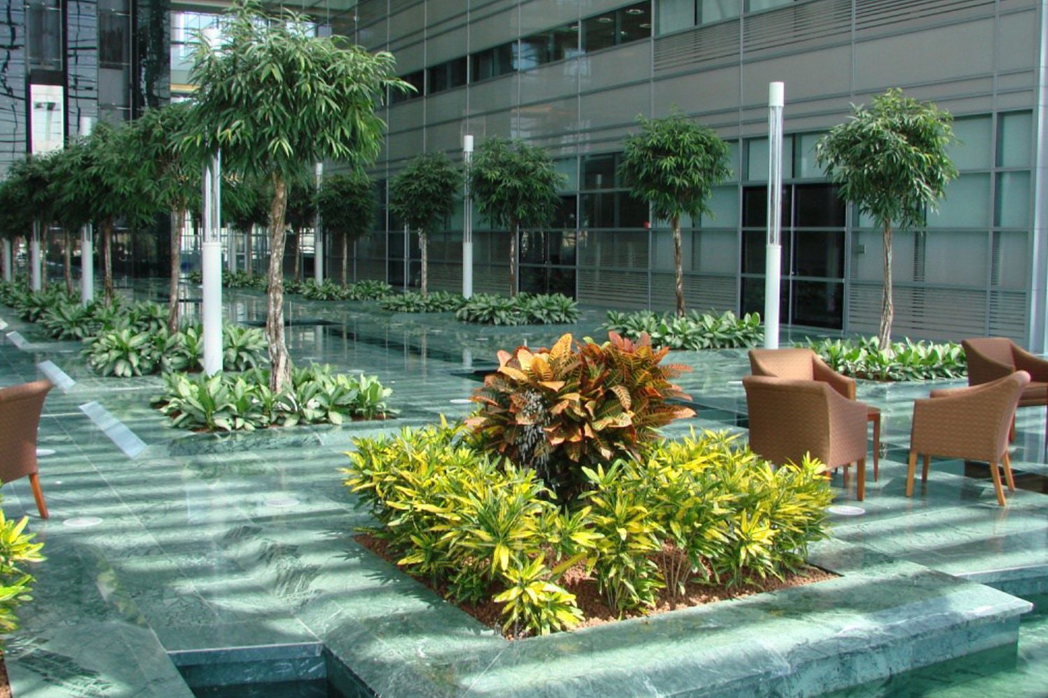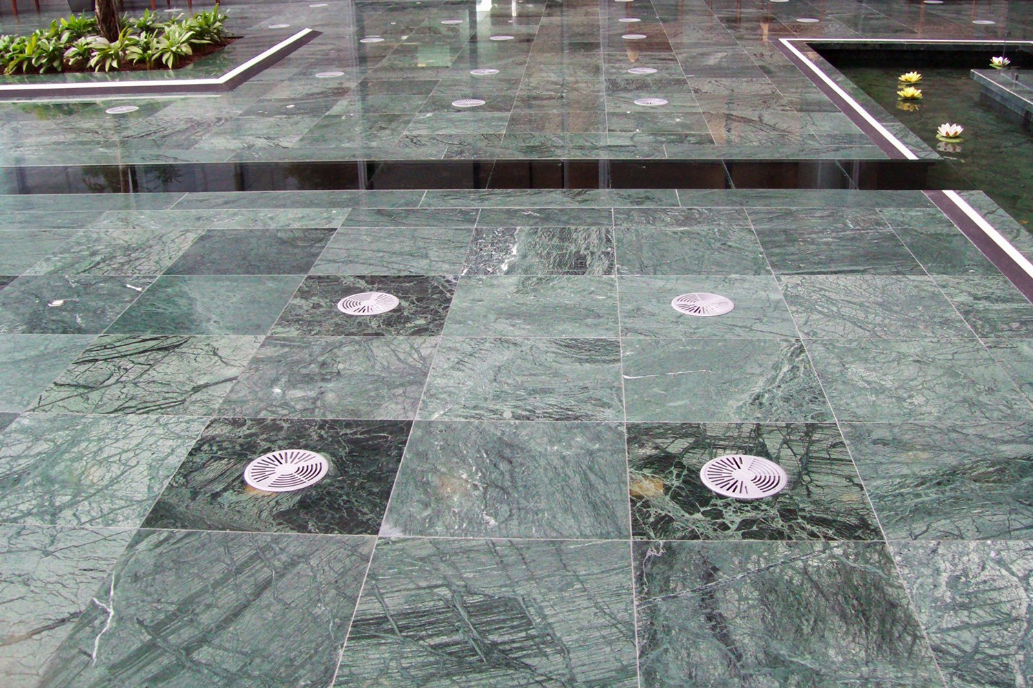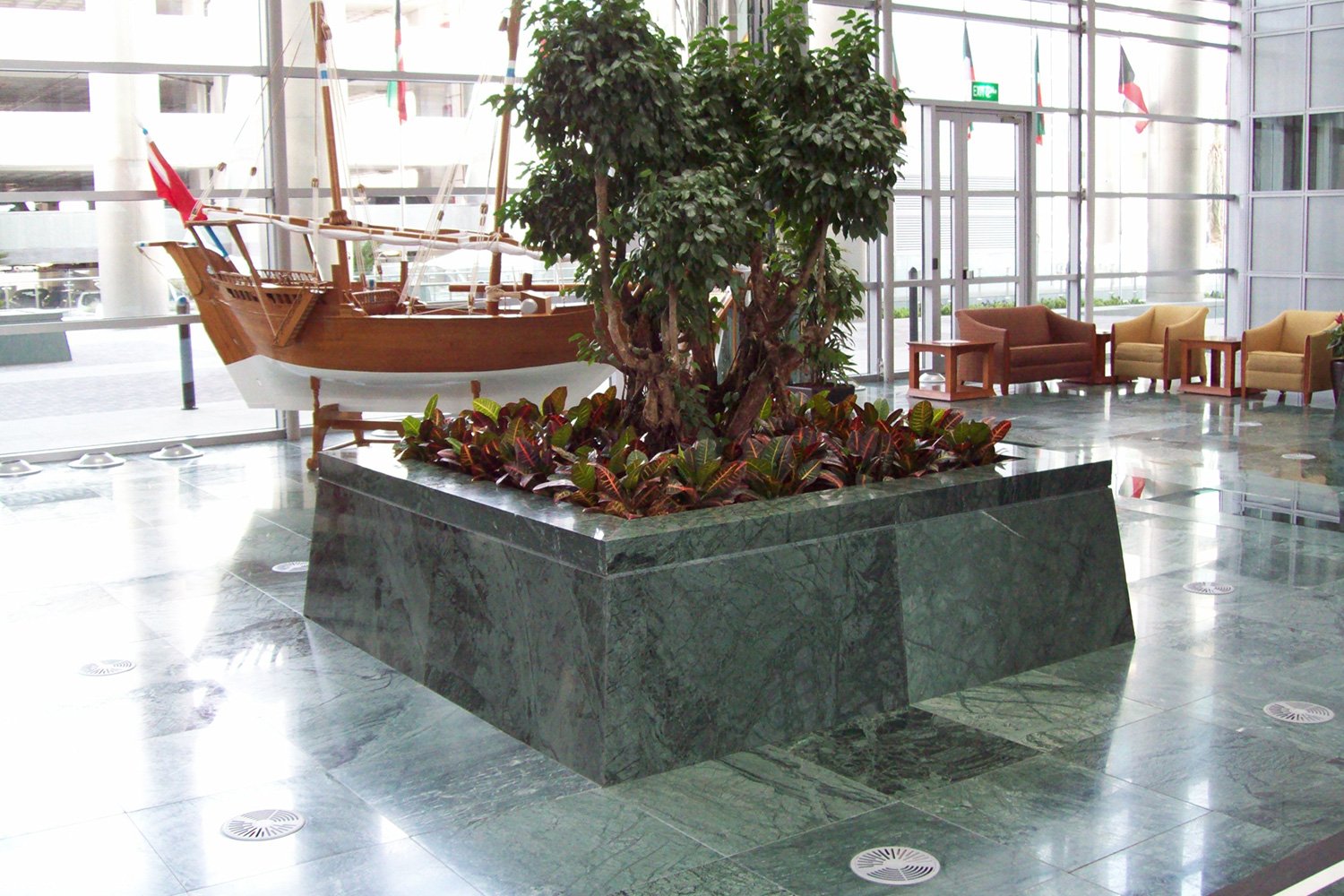 6.000 mq di pavimento sopraelevato con anima in solfato di calcio ad alta densità e finitura superiore in marmo, nelle aree pubbliche.