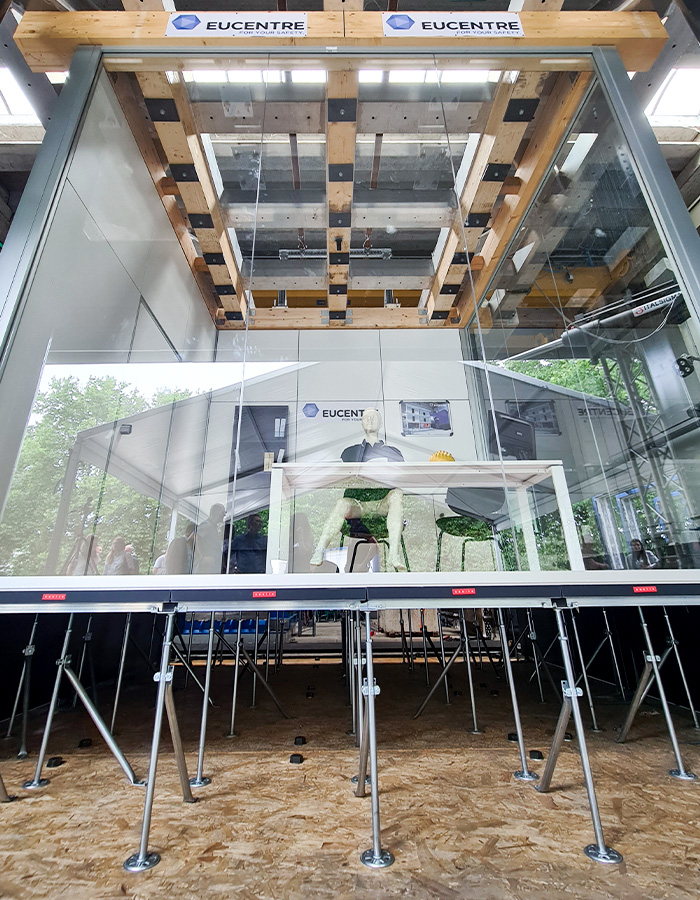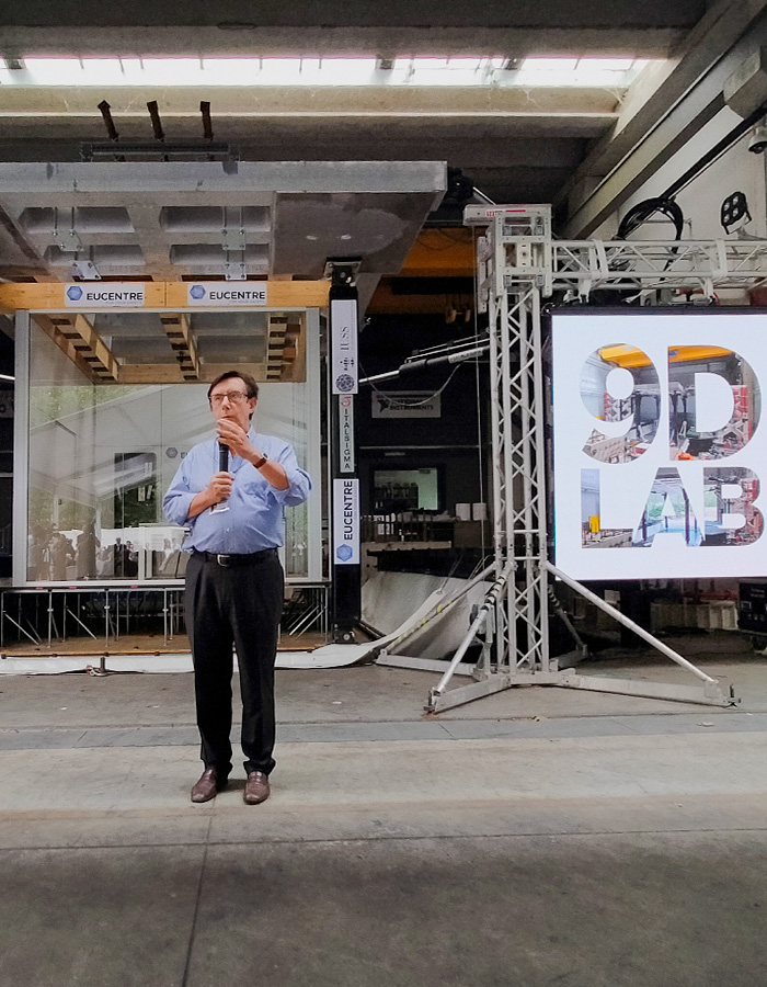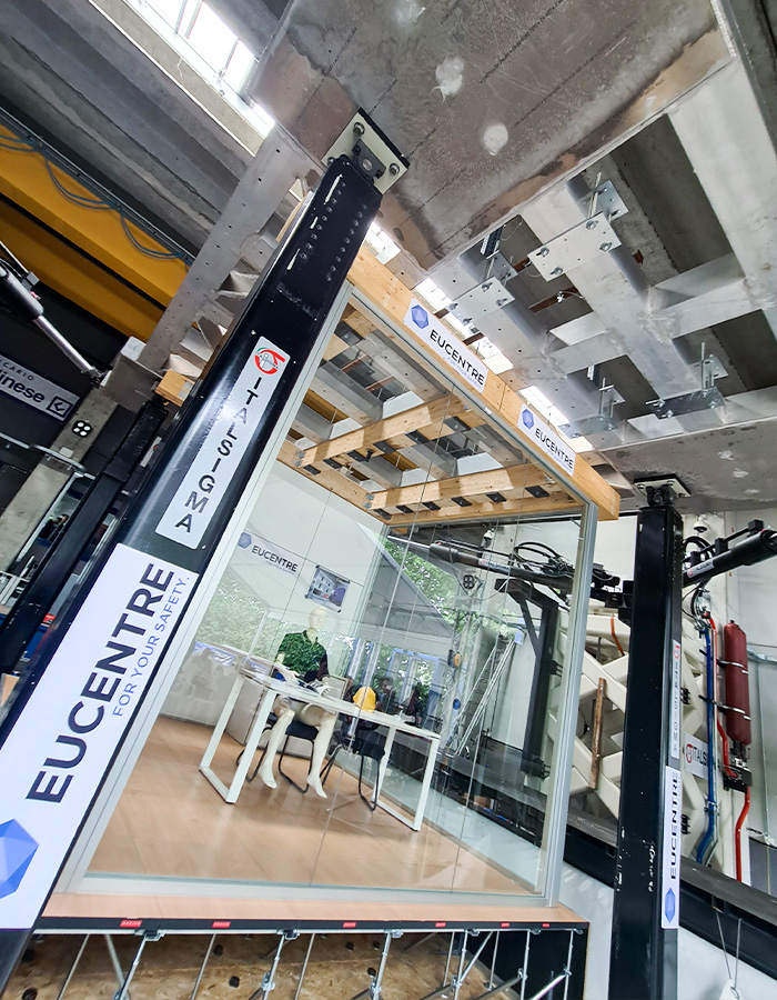 L’inaugurazione del sistema 9D LAB ha avuto luogo sotto gli occhi di circa 150 tra ricercatori, professionisti e rappresentanti di aziende, con lo svolgimento di prove dinamiche multi-assiali su un assemblaggio di pareti divisorie per ufficio in vetro e melaminico installate sul pavimento sopraelevato Nesite, partner dell’esperimento.