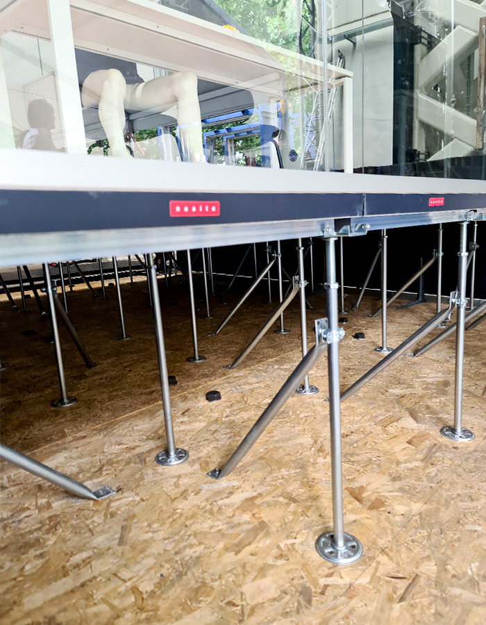 La pedana progettata per il test d’inaugurazione è alta circa 60 cm ed è stata installata con un sistema di controventatura che consiste nell’integrazione della struttura del pavimento sopraelevato con appositi sostegni chiamati tiranti. La difficoltà nella realizzazione è stata costituita dall’assenza del muro portante di contenimento, che abbiamo compensato con l’utilizzo calcolato di un maggior numero di tiranti.